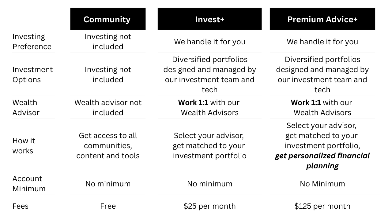 *Community plan is not an investing or advisory account. Community plan is for educational purposes only. Community plan includes access to (1) all our advisor led communities - #homebuying, #newbieinvestors, #cashflowmanagement, #womenwhowealth, #menwhowealth and (2) our exclusive, interactive Wealth Plan tool for help with cash flow management, home buying, tax optimization, and retirement planning and more